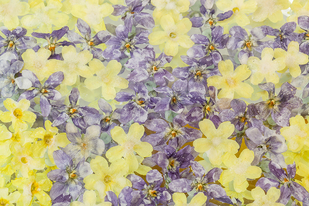Alle zusammen: Rosen, Veilchen, Himmelschlüsselchen, blaue Lilien, Malven, Tulpen,
